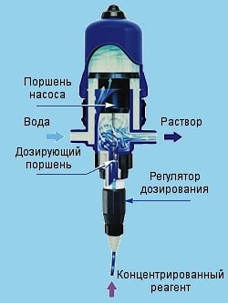 Благодаря уникальной технологии, подключенный в водную сеть дозатор использует для своей работы только давление воды. Дозатор обеспечивает пропорциональное непрерывное всасывание концентрированного продукта, а затем перемешивает его с водой в заданном соотношении и направляет полученный раствор далее по сети. Дозатор автоматически регулирует пропорциональность в зависимости от изменения расхода воды.